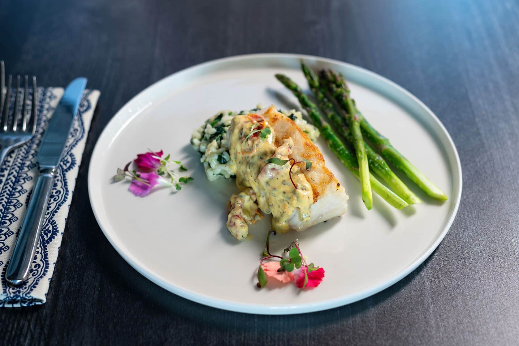 Wild Alaskan Halibut: The Wild Alaskan Halibut at Kaiser Grille is a fresh, vibrant dish that highlights the pristine quality of the fish. The halibut is perfectly cooked, flaky, and moist, served in a Thai yellow curry and coconut milk sauce infused with lemongrass and ginger. This flavorful sauce adds a subtle kick that pairs well with the delicate taste of the halibut. Accompanied by butter-whipped Yukon Gold potatoes and sautéed spinach, as well as a roasted pineapple and mango salsa that brings a refreshing, tropical twist, this dish is both exotic and comforting, making it a standout on the menu.