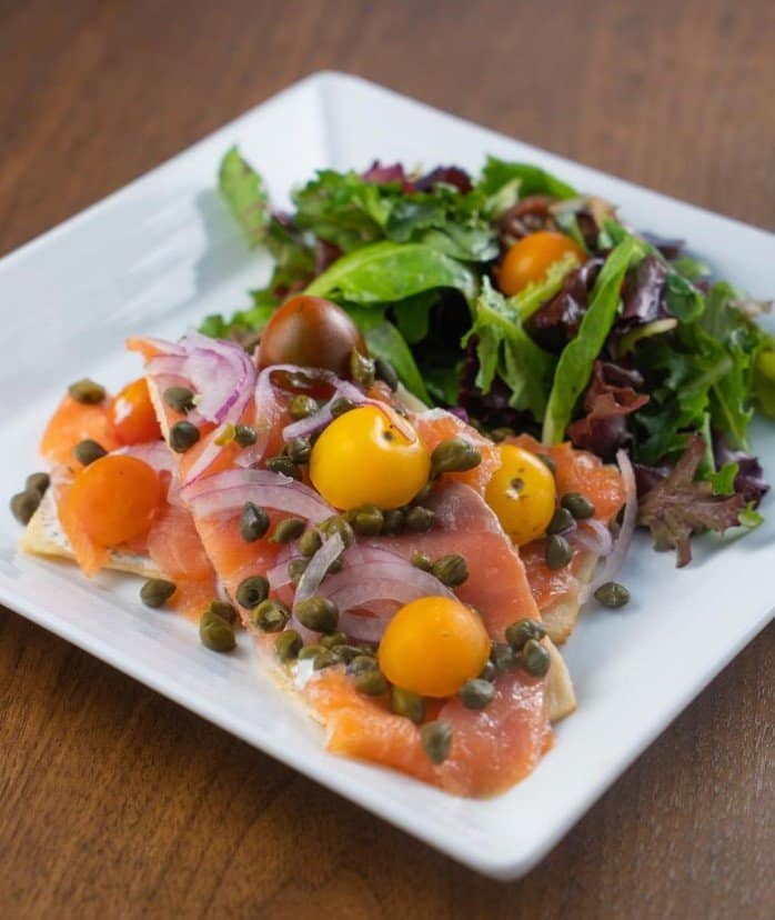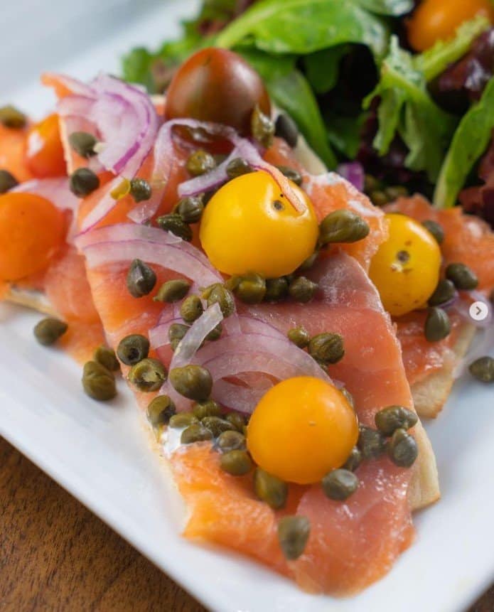 Chilled Smoked Salmon Flat Bread: A delightful blend of flavors, the Chilled Smoked Salmon Flat Bread is a refreshing and light option. The crisp flatbread is topped with a creamy dill spread, thinly sliced smoked salmon, capers, red onion, and baby heirloom tomatoes, creating a delicious balance of savory, tangy, and slightly sweet flavors. It’s perfect for a light lunch or as a shared appetizer to start your meal.